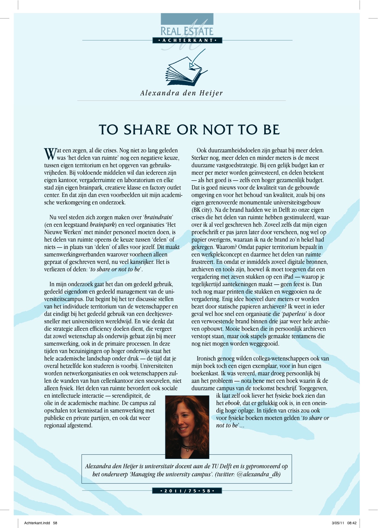 In 2011 I also wrote two articles in Dutch that I ‘forgot’ to upload: “Campus wordt duurzame kennisstad – het delen van ruimte als positieve keuze” (Hoger Onderwijs Management, nr. 4, jaargang 3, mei 2011, pagina 8 t/m 10) AdH in HO_management_mei 2011 (p8-10) en “Waarde toevoegen op de campus” (Real Estate Magazine 76, 14e jaargang, juni 2011, pagina 24 t/m 27) REM76-AlexandraDenHeijer (p24-27).