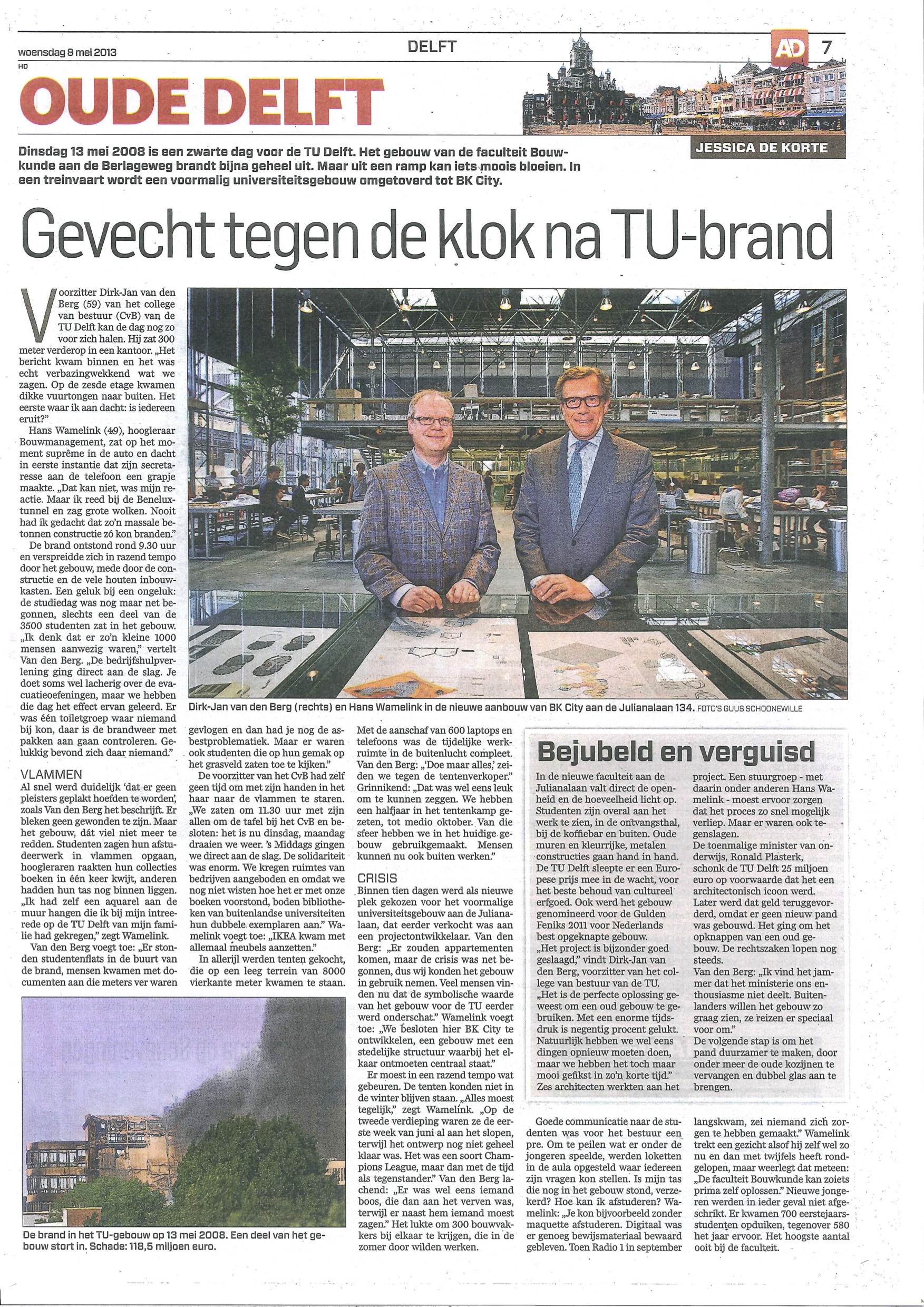 Nonetheless, we used this crisis to (re-)build “BK city” at Julianalaan 134 in Delft and received compliments from all over the world for both the process (just months: BK city timeline and project organisation) and the result (new life for old academic heritage). It is amazing to realize how a disaster for the faculty could also bring so much success for the same faculty. As a BK city project team we are still very proud of what we achieved after the fire.